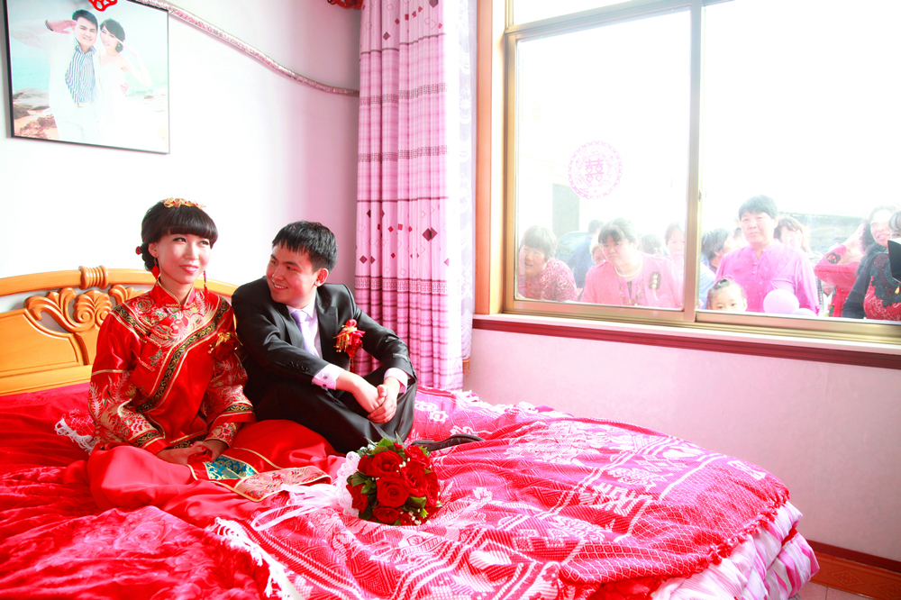 婚礼上拍摄的照片。当地婚礼习俗:“座时辰”,窗外邻居在看“喜”。
