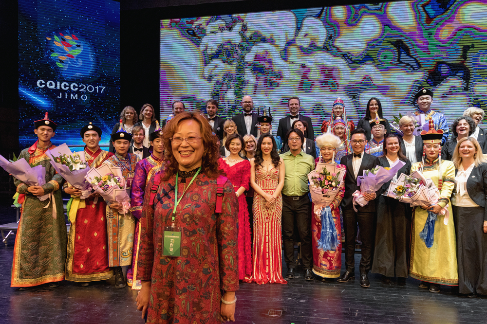 当地合唱大会闭幕式上,一名工作人员跟参加大会的各国朋友合影留念的欢乐瞬间。