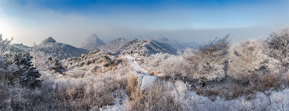 昆嵛山,最高海拔923米,背着装备徒步登顶。从2017年十一月就开始关注此山的雾凇天气,经历过几次失败后,终于在2017年最后一天的早上,大自然赋予了我最慷慨的眷顾。