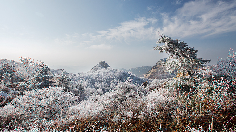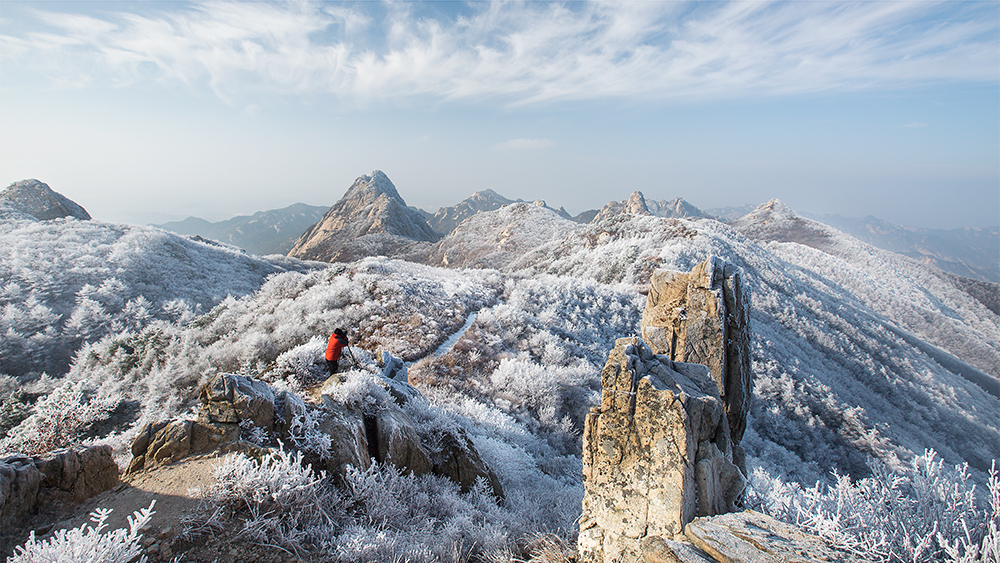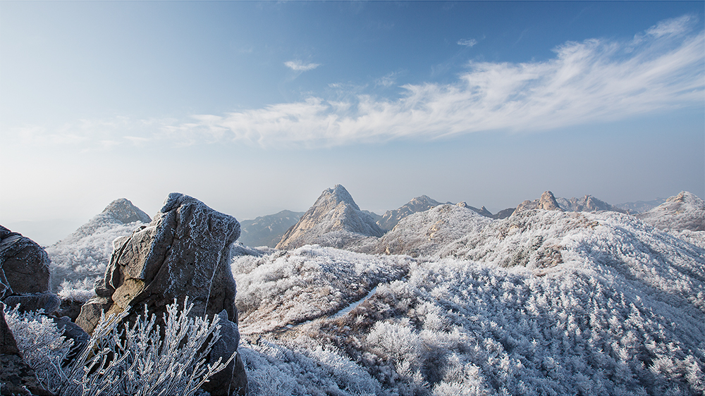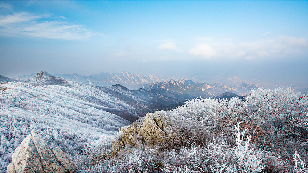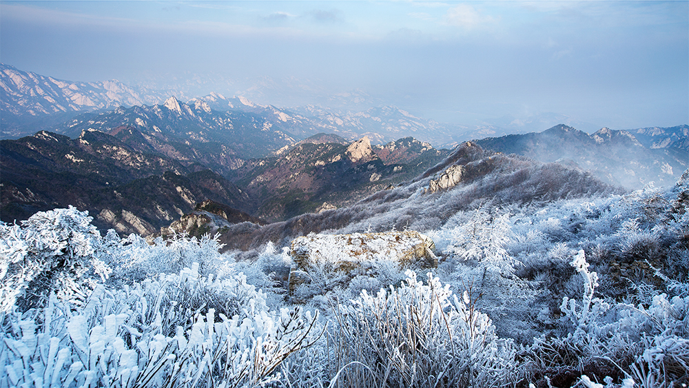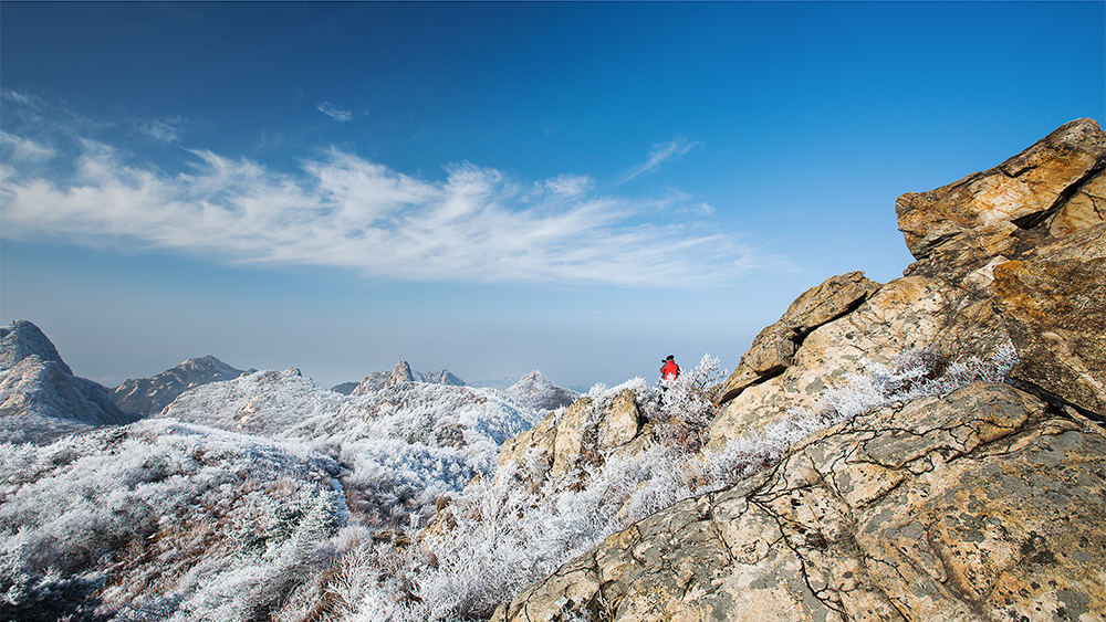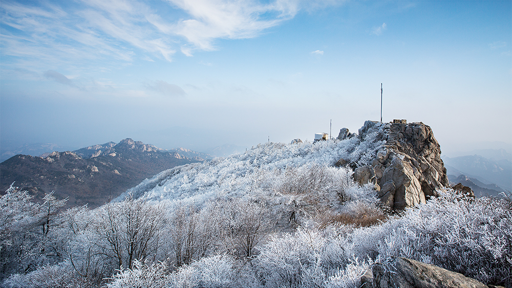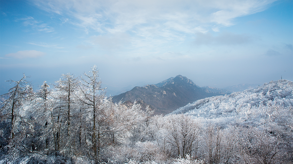 早上的时候山顶大雾弥漫,能见度不足5米,上午8点20分的时候,天瞬间放晴,银装素裹中的昆嵛山一览无余的展现出来。。