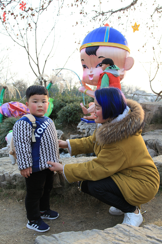 2017年2月拍于台儿庄古城。染着蓝色头发的新潮妈妈,正爱抚着萌气十足的儿子,母子情深,令人感动。