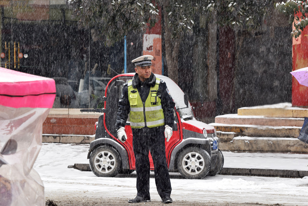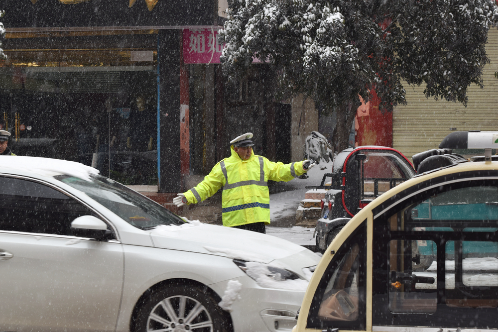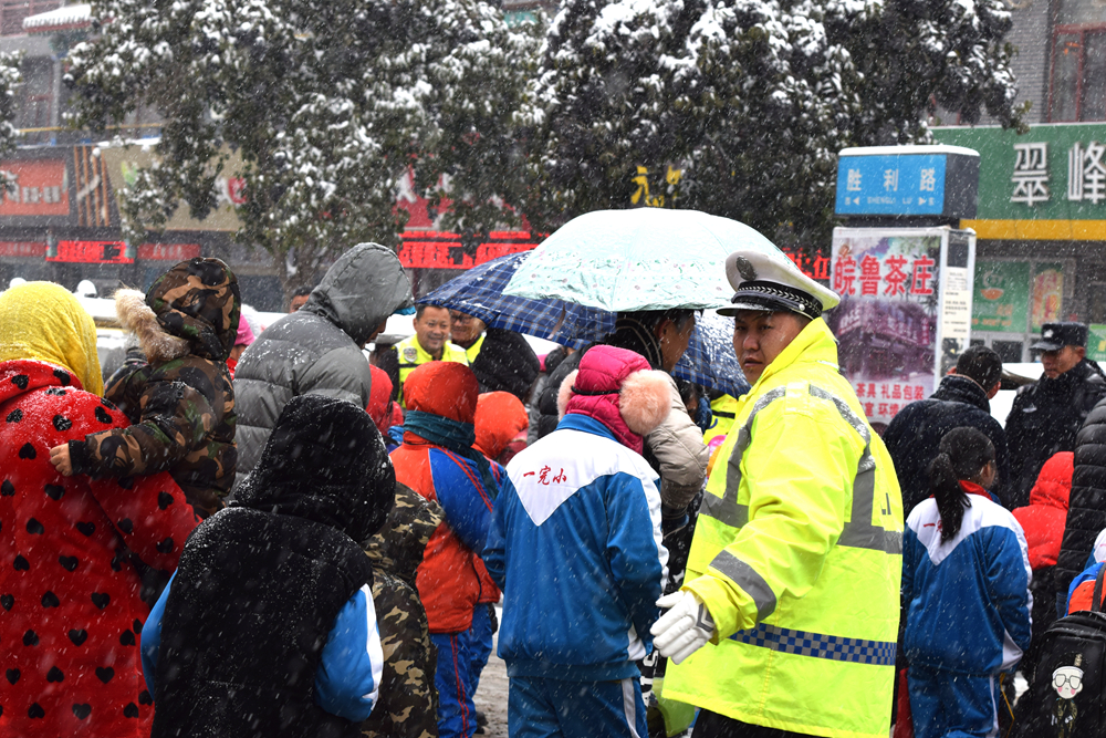 昨天一场大雪席卷单城,风大雪大路滑,当我们在家开着暧气不在外出时,我在单县一完小北面的狭窄路口拍下了这个感人的画面,交警在风雪中为一完小的学生正在保驾护航,用自己的身体为学生挡下了车,留下了一条安全线,