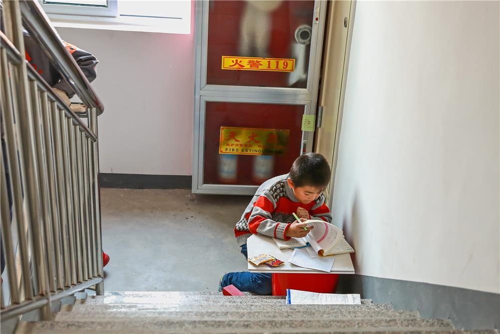 2018的第一场雪后,学校放假,气温零下十一度,天气太冷了,小区的护工争取管理同意后带着孩子来到小区楼道学习,说比家里暖和多了。