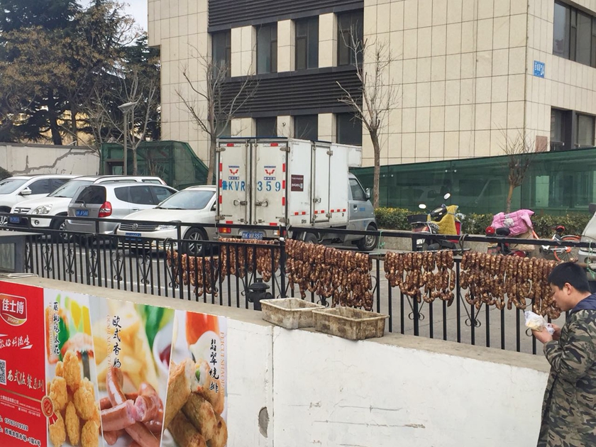 20180121威海环翠区 栏杆上挂满了半成品的灌肠(灌肠是北方人冬季自制的一大地方小吃),墙壁上的广告图以及忙于生计的大男孩,构成了画面的和谐。当然,画面中还有传统与现代的元素在里面。