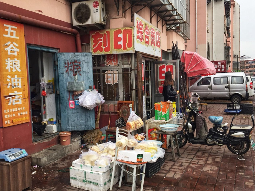 20180114威海环翠区 去西城市场买菜归来,途经此处,驻足等来的这个画面。这是一条老街道,首先映入眼睑的是诸多的面食,然后就是大铁门上的微信和支付宝二维码。再看,咦!门内有一双高跟鞋在不停的摆动,好了,我摁下了快门。可是女孩的信息不明显,我就等,结果有一长发女孩出入旁边的商店,这样就OK了。