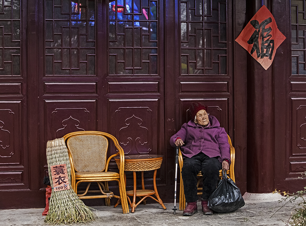 台儿庄古城,一位游古城的老人,在走廊上休息。