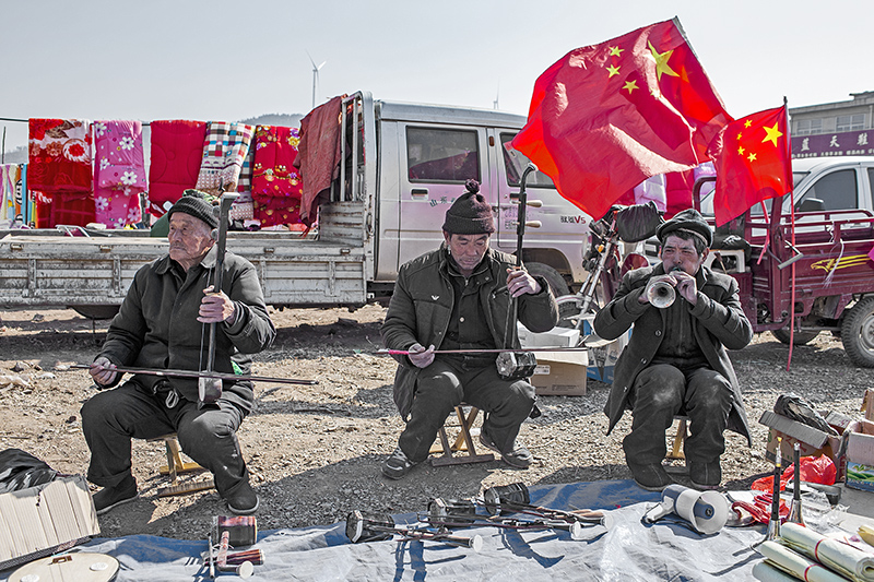 费县石井大集,几位在红旗下演奏传统乐器的老人。