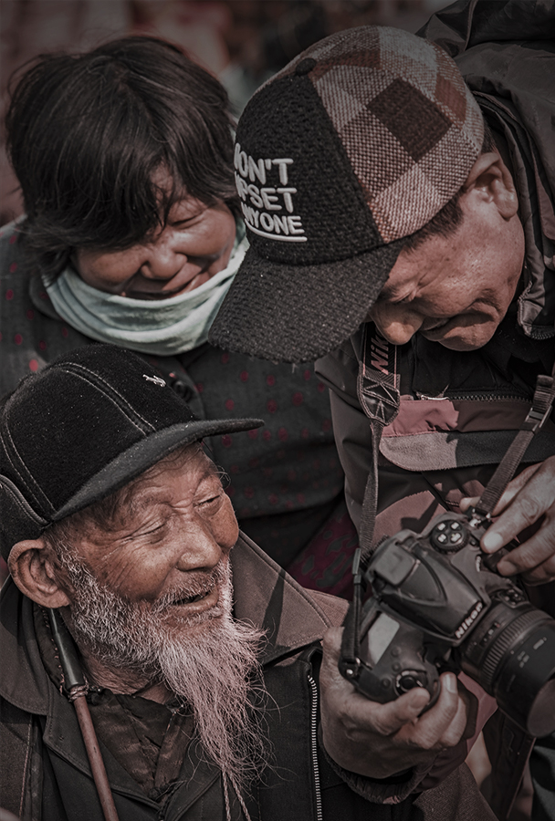 山亭大集,一位老人看到摄影师为自己拍的照片,露出喜悦的表情。