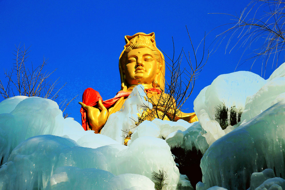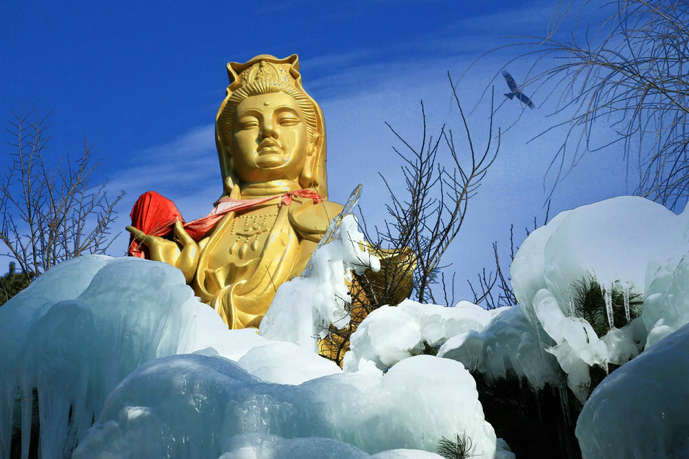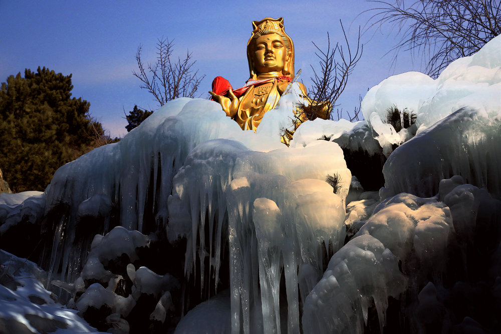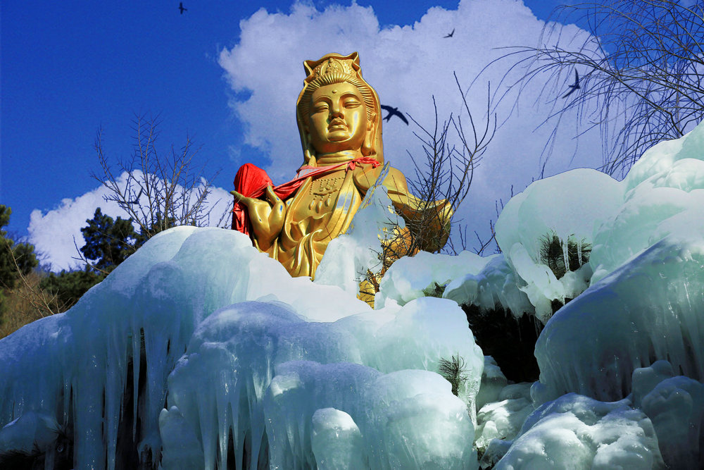 2018年2月4日,济南南部山区的水帘峡景区出现冰瀑奇观。景区内水帘洞之上的观世音菩萨铜像下,冰瀑如祥云缭绕,活灵活现,好似菩萨在腾云驾雾一般。