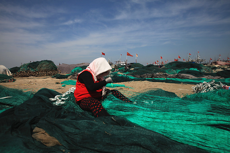 荣成宁津东褚岛渔业公司码头的织网女工