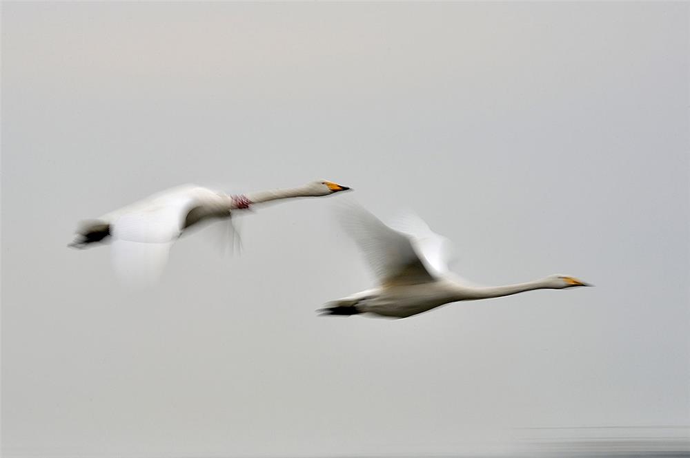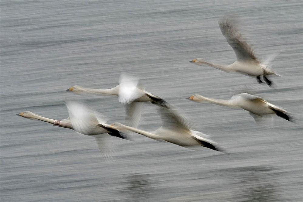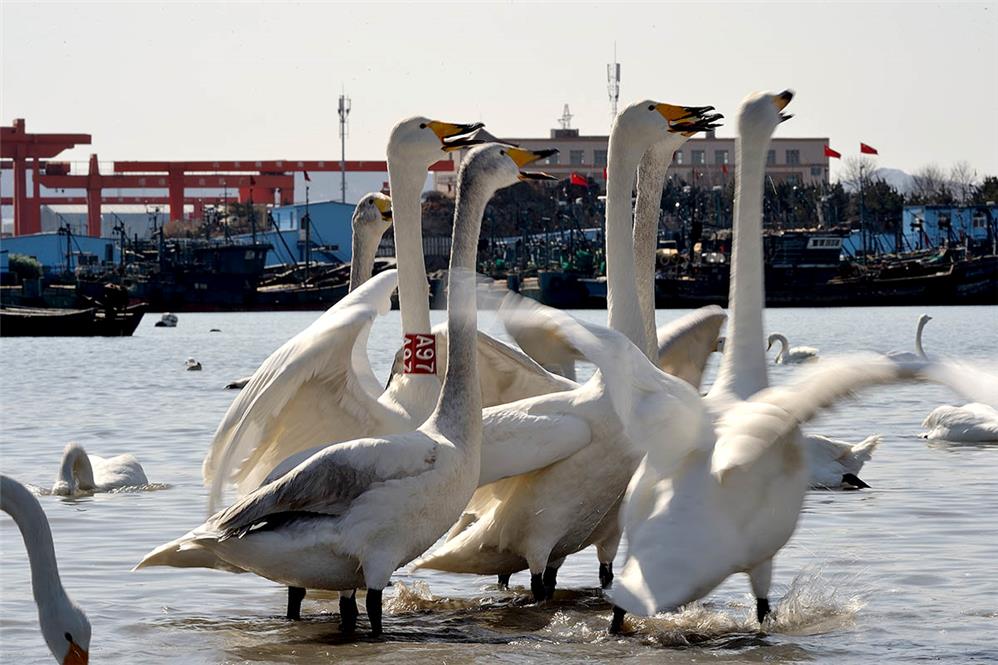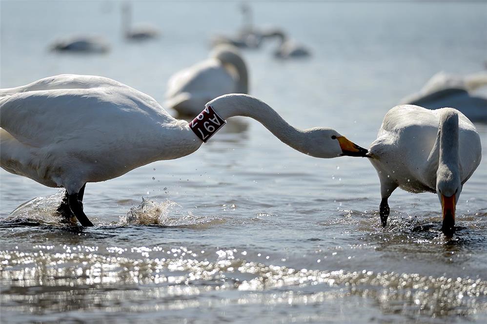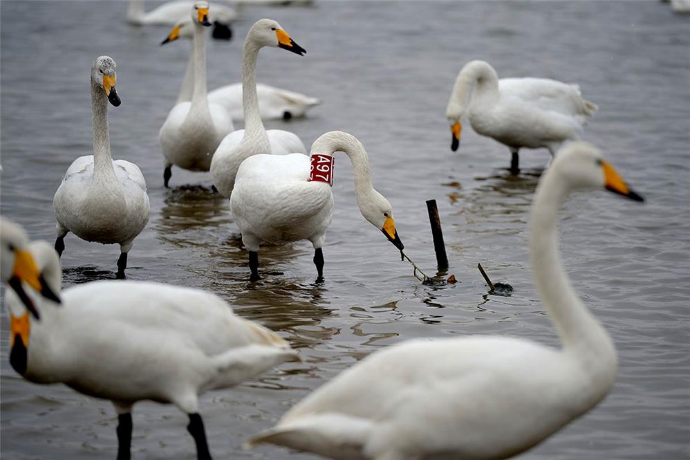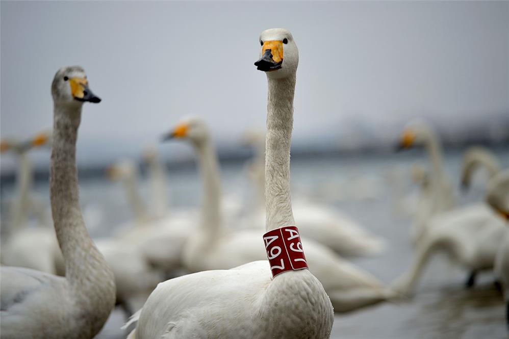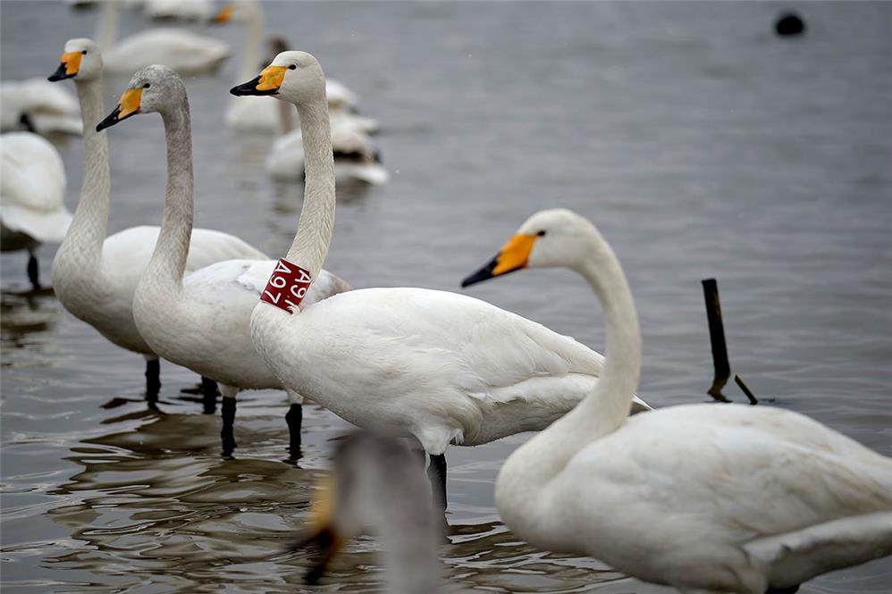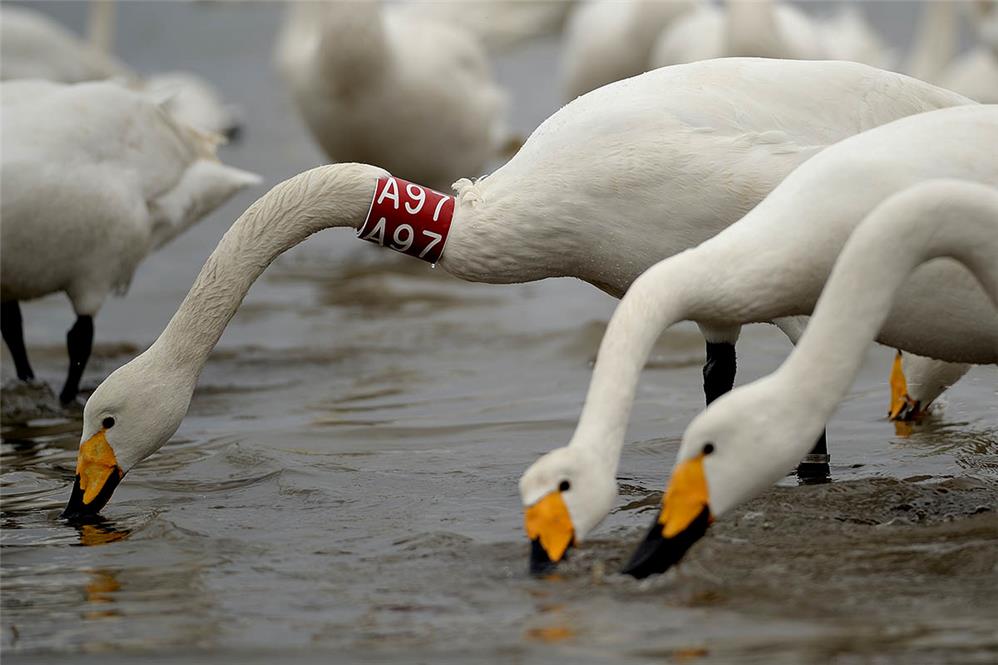2018年春节摄于荣成烟墩角天鹅湖。这只佩戴A97环志的天鹅为雌性,2007年出生在蒙古国北部的一条小河里,2009年被一国际组织带上环志,这已是她第9个年头飞抵此地过冬,同来的还有她的丈夫和孩子们。