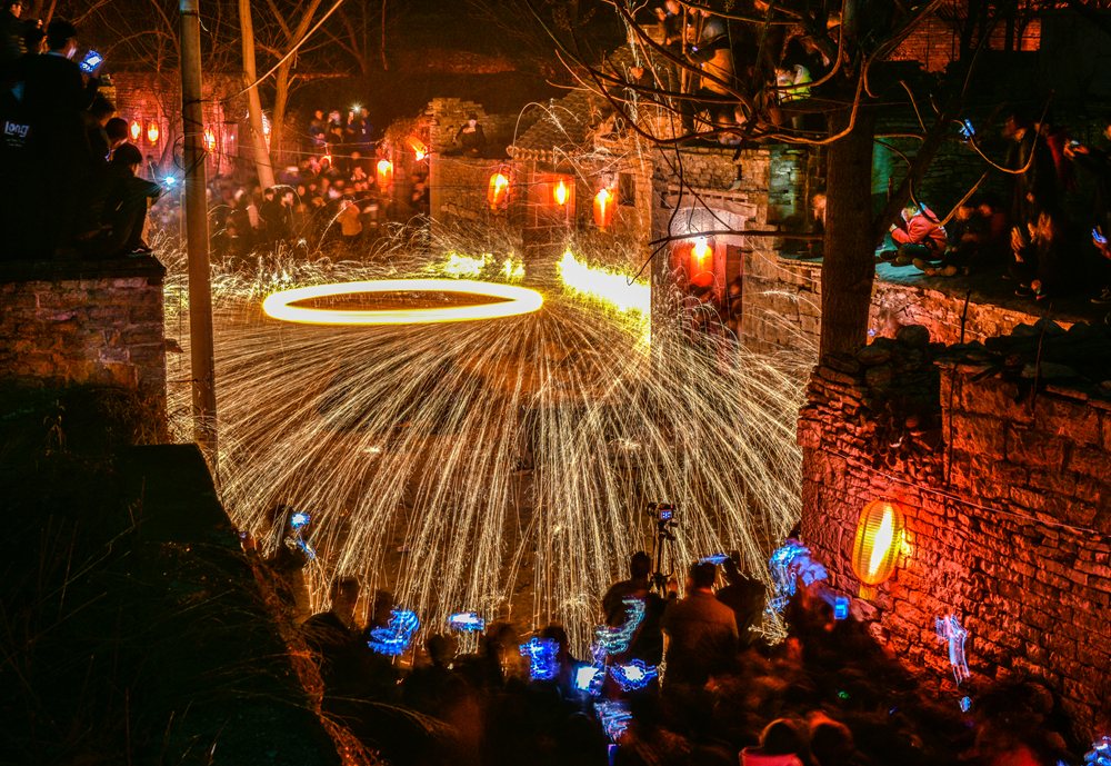 前王庄村“揉花篮”民俗表演始于清代康熙年间,距今已有三百多年历史。表演者将生锅铁捣碎成高粱粒大小,掺入打火石,用纸包裹后贴满生铜钱,装入填满木炭的漏斗形状铁壶皮,以木炭为引信,点燃后单人慢摇,两分钟后四人合力高速摇动,将产生的火花通过石头墙反弹,营造出火光漫天的视觉效果。