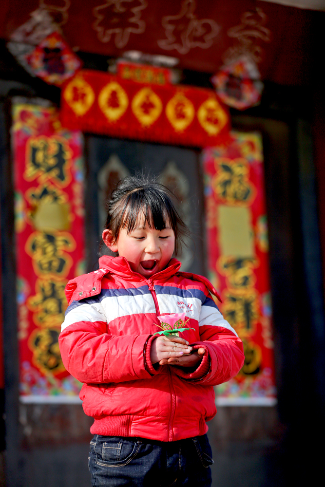 元宵节到了,一个小山村的一个小姑娘,在贴着大红对联的一户门前,手捧着一盏花灯,开心的笑着,那笑容醉人心底!