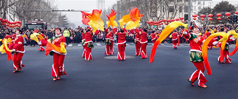 人们舞动手里的彩带,舞姿翩翩,抒发着春节的快乐。