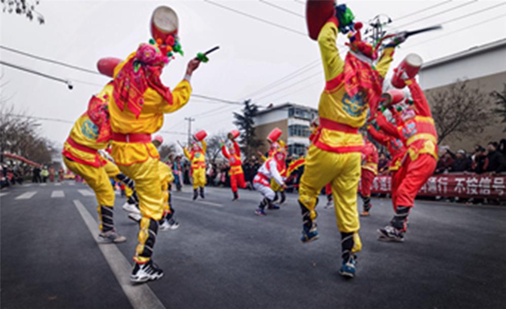 春节里,人们敲打着腰鼓激情满怀,欢度春节。