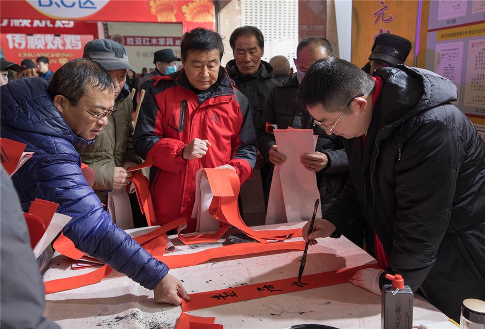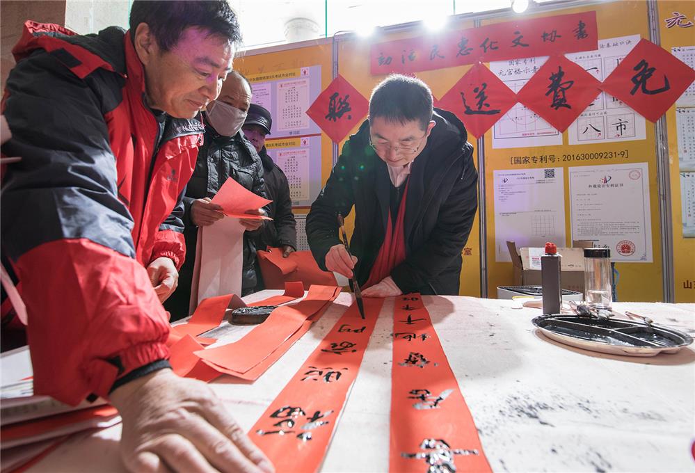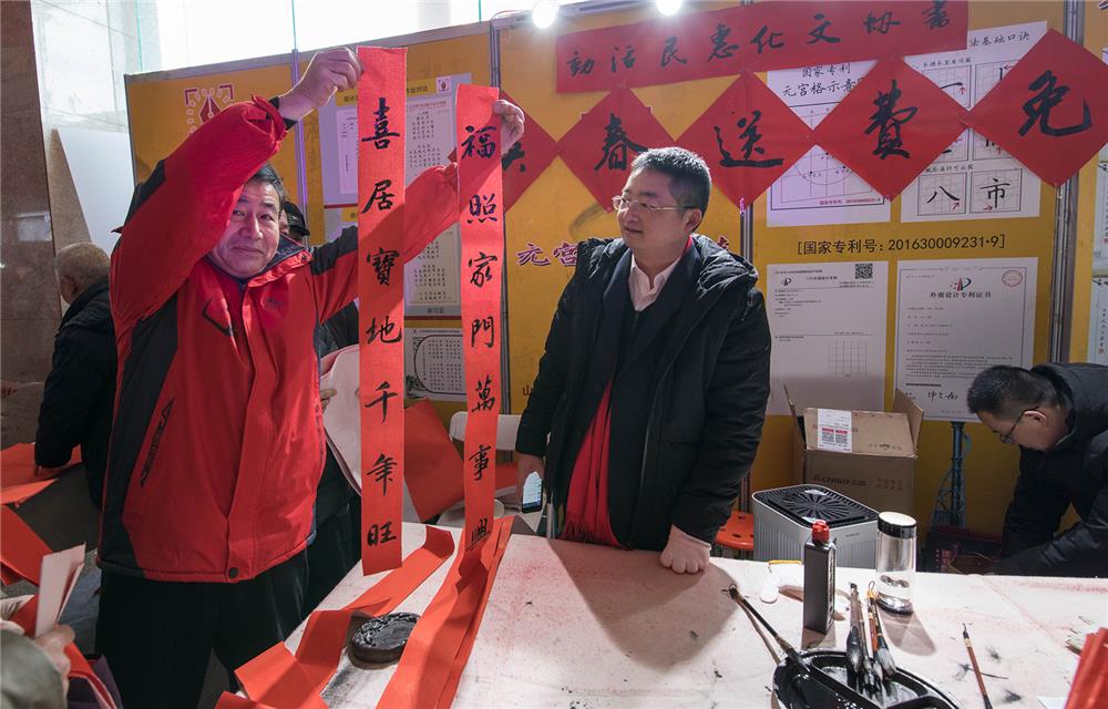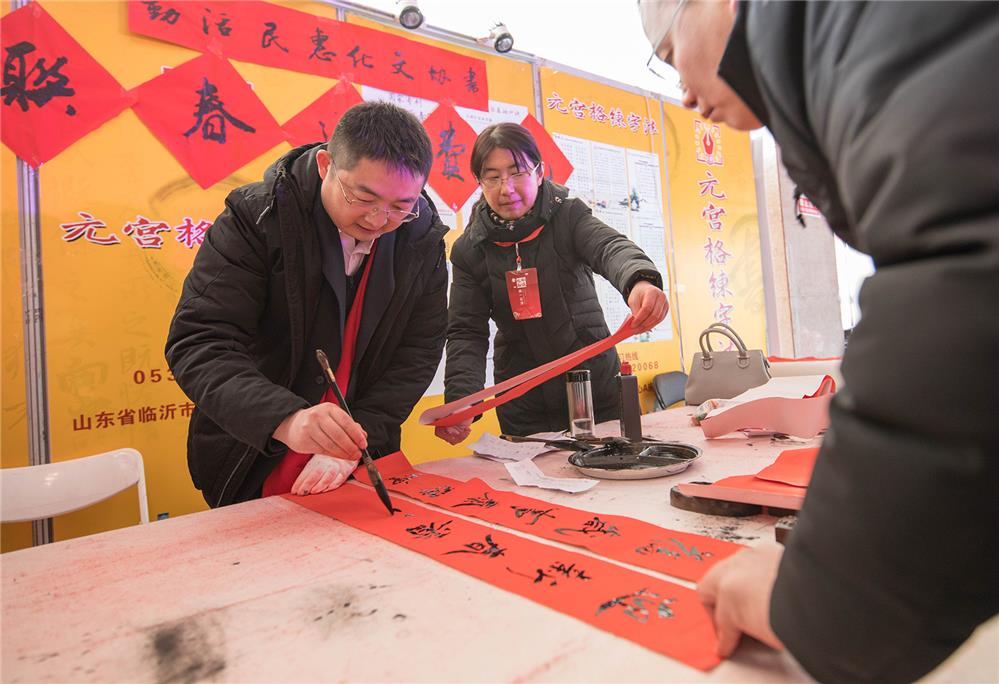 一名青年书法家,在临沂市年货大集上为群众免费赠送春联。