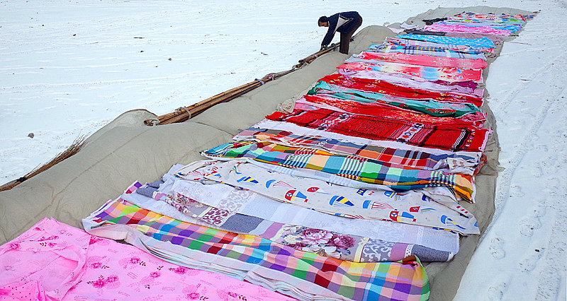 集市上,摆好布匹只待客来
