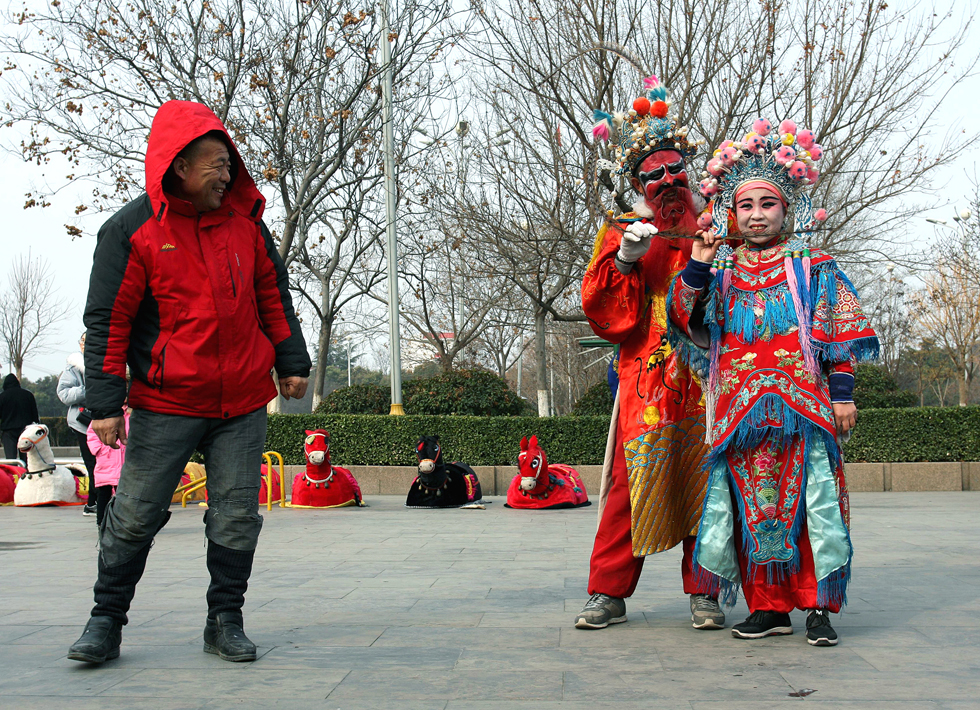 民俗表演的演员亮相,一男子驻足观看。