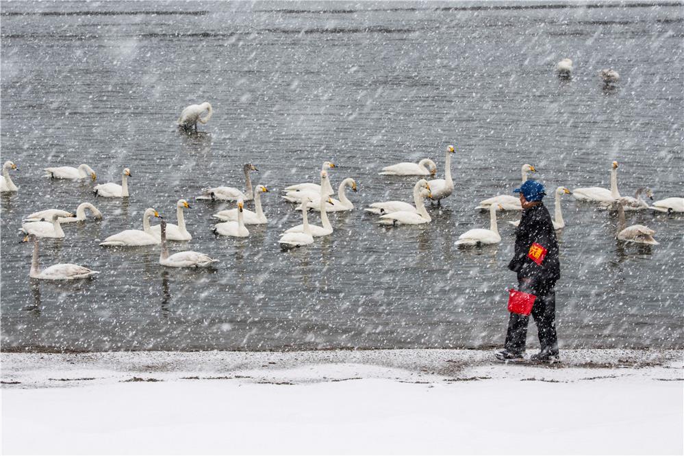 烟墩角在雪中喂养天鹅的人