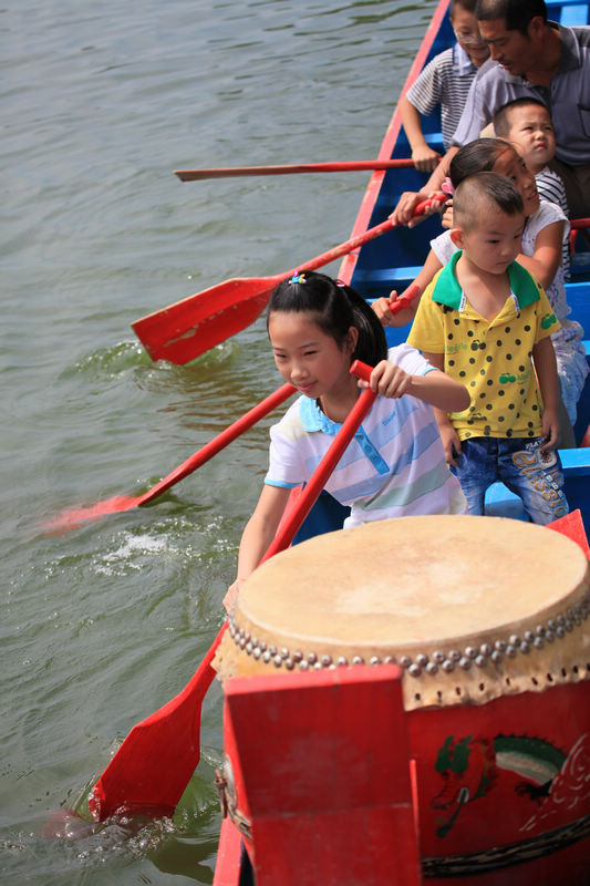 拍于台儿庄大运河龙舟赛现场。比赛结束后,小观众们上船体验划船的感觉。