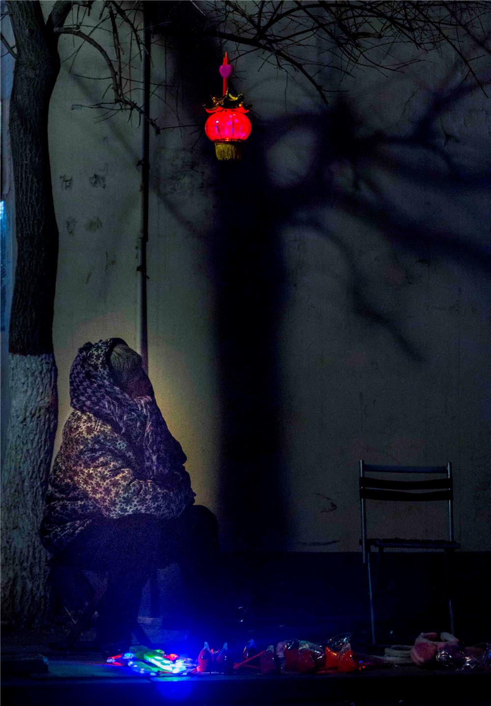 作品与2018年3月2日拍摄于山东省日照市五莲县,正月15当晚,一位奶奶在冷风中摆着地摊,头顶上还有一个小小的红灯笼。